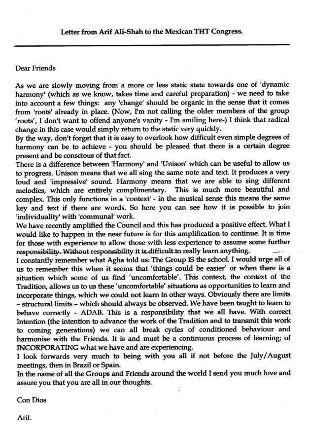 Recuerdo constantemente lo que Agha nos dijo: el Grupo ES la escuela. Recomendaría a todos encarecidamente que recordáramos esto cuando parezca que “las cosas podrían ser más fáciles” o cuando se dé una situación que algunos encontremos “incómoda”. Este contexto, el contexto de la Tradición, nos permite utilizar tales situaciones “incómodas” como ocasiones para aprender e incorporar cosas que no podríamos aprender de otra manera. Evidentemente, hay límites –límites estructurales– que deben observarse siempre. Nos han enseñado a aprender a comportarnos correctamente – ADAB. Ésta es una responsabilidad que tenemos todos. Con la intención correcta (la intención de desarrollar el trabajo de la Tradición y transmitir este trabajo a las generaciones futuras) todos podemos romper los ciclos de comportamiento condicionado y armonizarnos con los Amigos. Es y debe ser un proceso continuo de aprendizaje; de INCORPORAR lo que hemos experimentado y lo que estamos experimentando.